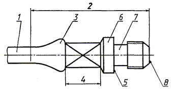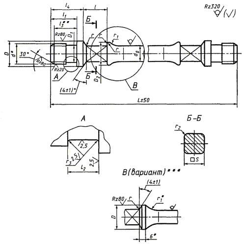 где smin - минимальное напряжение в теле штанги за цикл нагружения; 3.2.9 зона термического влияния: Участок тела насосной штанги длиной 250 мм, отсчитываемый от подэлеваторного бурта в сторону тела штанги; 3.2.10 продольные дефекты проката: Дефекты проката в соответствии с ГОСТ 21014, расположенные вдоль оси проката; 3.2.11 поперечные дефекты проката: Дефекты проката в соответствии с ГОСТ 21014, расположенные перпендикулярно к оси проката; 3.2.12 торцевая контактная поверхность: Кольцевая поверхность, по которой контактируют торец штанговой муфты с торцем упорного бурта насосной штанги (без учета фасок). 4 Конструкция, основные параметры и размерынормальной длины - 7620; 8000*; 9140 мм; укороченной длины - 610; 915; 1000*; 1220; 1500*; 1830; 2000*; 2440; 3050 и 3660 мм. * Применяется по согласованию с потребителем. 4.2 Конструкция и размеры штанг должны соответствовать указанным на рисунке 2 и в таблице 1. Конструктивные длины L штанг (без муфт) и их массы приведены в приложении Б. 4.3 Штанговые муфты (далее - муфты) предусматриваются с внутренней резьбой на обоих концах и должны изготовляться следующих типов: соединительные - для соединения штанг одинаковых условных размеров; переводные - для соединения штанг разных условных размеров. 4.4 Муфты каждого типа должны изготовляться исполнений: 1 - полноразмерные с лысками под ключ; 2 - полноразмерные без лысок; 3 - уменьшенного диаметра. 4.5 Конструкция, размеры и масса соединительных муфт должны соответствовать указанным на рисунке 3 и в таблице 2, а переводных муфт - на рисунке 4 и в таблице 3. Примечание - Допускается по заказу потребителя изготовление муфт длиной (и, соответственно, массой), большей, чем предусмотрено в таблицах 2 и 3. * Размер обеспечивается инструментом. ** Размер указан до накатки резьбы. *** Допускается другая форма сопряжения ударного бурта с квадратной шейкой. Рисунок 2 - Насосная штанга Таблица 1 мм
