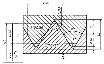 4.7 Профиль и основные размеры резьбы штанг и муфт должны соответствовать указанным на рисунке 5 и в таблице 5, а допуски и расположение полей допусков резьб - на рисунке 6 и в таблице 6. * R = 0,28 … 0,36 Рисунок 5 Таблица 5