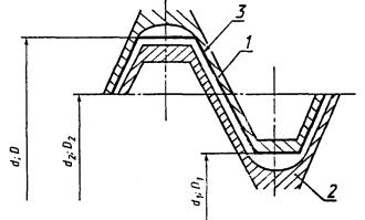1 - поле допуска внутренней резьбы; 2 - поле допуска наружной резьбы; 3 - номинальный профиль; d; D - номинальный наружный диаметр; d1; D1 - номинальный внутренний диаметр; d2; D2 - номинальный средний диаметр Рисунок 6 Таблица 6