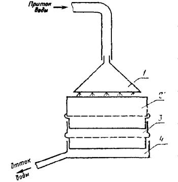 где т1 - масса остатка на сите с сеткой № 02, г; m2 - масса остатка на сите с сеткой № 0063, вычисленная с учетом остатка на сите с сеткой № 02, г; т - масса навески поливинилхлорида, г. 1 - насадка с отверстиями или шланг; 2 - сито с размером ячеек 0,200 мм; 3 - сито с размером ячеек 0,063 мм; 4 - поддон для стока воды. Черт. 1 За результат измерения принимают среднее арифметическое результатов двух параллельных определений, допустимое расхождение между которыми не должно превышать: для массы остатка на сите № 02 - 0,010 %, для массы остатка на сите № 0063 - 0,5 %. Окончательный результат измерения округляют до второго десятичного знака - для остатка на сите с сеткой № 02 и до целого числа - для остатка на сите с сеткой № 0063. 3.5.2.2 - 3.5.2.3. (Измененная редакция, Изм. № 4). 3.6. Вязкость пасты определяют по ГОСТ 25276-82 при температуре (25,0 ± 0,1) °С, при скорости сдвига 1; 5; 50 с-1 и проведении замеров через 1 мин. Навеску готовят следующим образом: 200 г поливинилхлорида, взвешенного с погрешностью не более 0,1 г, помещают в стакан № 6, 7 по ГОСТ 9147-80, приливают 133,3 г диоктилфталата по ГОСТ 8728-88 и перемешивают до полного смачивания поливинилхлорида пластификатором, а потом переносят в смеситель (черт. 2 рекомендуемого приложения 2) вместимостью 1000 см3. Допускается применение навески другой массы при соотношении поливинилхлорида и диоктилфталата (60:40) м.ч. Смеситель плотно закрывают крышкой, включают охлаждение, мешалку и через 15 - 20 мин подключают вакуум-насос. Смешение проводят при температуре (25,0 ± 1) °С в течение 60 мин до получения однородной массы, поддерживая вакуум (13,3 - 19,9) ´ 102 Па (10 - 15 мм рт. ст.). Пасту перед испытанием термостатируют 20 мин. (Измененная редакция, Изм. № 3, 4). 3.6.1. - 3.6.3. (Исключены, Изм. № 3). 3.7. Определение показателя набухаемости 3.7.1. Проведение испытания После определения вязкости пасты по п. 3.6 поднимают температуру термостата до (45,0 ± 0,1) °С и проводят термостатирование при этой температуре в течение 20 мин, затем измеряют вязкость пасты начальную и через 1 ч после начала испытания. (Измененная редакция, Изм. № 4). 3.7.2. Обработка результатов Показатель набухаемости (X4) вычисляют по формуле