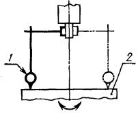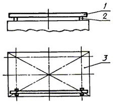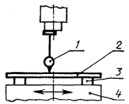 1.2. В столах размеры пазов и расстояния между ними - по ГОСТ 1574. 1.3. В станках должна быть предусмотрена возможность реверсирования шпинделя. 2. ПРОВЕРКА ГЕОМЕТРИЧЕСКОЙ ТОЧНОСТИ СТАНКА2.1. Точность установки станка по уровню - не более 0,1 мм на длине 1000 мм. 2.2. Общие требования к испытаниям станков на точность - по ГОСТ 25338. 2.3. Нормы точности станков не должны превышать значений, указанных в пп. 2.3.1 - 2.3.8. 2.3.1. Плоскостность рабочей поверхности стола (черт. 2) Черт. 2 Допуск, мм, для длины стола, мм: до 800............................................................. 0,06 св. 800 до 1120.............................................. 0,08 св. 1120 до 1600............................................ 0,16 Выпуклость не допускается На рабочую поверхность стола 3 в двух точках заданного сечения устанавливают две специальные опоры 2, на которые рабочей поверхностью кладут поверочную линейку 1 так, чтобы расстояния от проверяемой поверхности до рабочей поверхности линейки у ее опор были равны. Расстояние между линейкой и проверяемой поверхностью измеряют щупом или блоком плоскопараллельных концевых мер длины. Измерения проводят в поперечном и продольном направлениях не менее чем в трех сечениях по длине базовых поверхностей стола (двух крайних и среднем) и диагональных направлениях. В каждом сечении определяют наибольшую разность измеренных расстояний. Отклонение от плоскостности равно наибольшему из полученных результатов. 2.3.2. Торцовое биение поверхности стола (черт. 3) Черт. 3 Допуск 0,08 мм на диаметре 500 мм На неподвижной части станка
