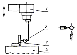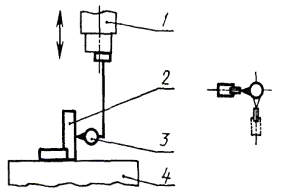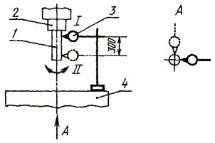 наконечник касался рабочей поверхности стола 2 в точке, удаленной от оси вращения на радиусе R За торцовое биение принимают наибольший из результатов измерений. 2.3.3. Перпендикулярность направлений продольного и поперечного перемещения стола в горизонтальной плоскости (черт. 4) Черт. 4 Допуск 0,05 мм на длине 500 мм Поверочный угольник 1 устанавливают на середину рабочей поверхности стола 3 таким образом, чтобы одна из его рабочих поверхностей была параллельна направлению продольного перемещения стола (показания показывающего прибора, измерительный наконечник которого касается этой поверхности угольника, должны быть одинаковыми в крайних точках хода). Затем показывающий прибор 2 устанавливают на неподвижной части станка так, чтобы его измерительный наконечник касался другой рабочей поверхности угольника и был перпендикулярен ей. Стол перемещают на заданную длину в пределах хода. Отклонение от перпендикулярности определяют как алгебраическую разность результатов измерений в крайних положениях стола на заданной длине. 2.3.4. Параллельность рабочей поверхности стола в продольном и поперечном направлениях по отношению к перемещению стола (черт. 5) Черт. 5 Допуск, мм, для длины перемещения стола, мм: до 560....................................................................................... 0,05 св. 560 до 710.......................................................................... 0,08 св. 710 до 900.......................................................................... 0,10 св. 900 до 1250........................................................................ 0,12 св. 1250 до 1900...................................................................... 0,18 На рабочей поверхности стола 4 на специальных опорах 3 устанавливают поверочную линейку 2 так, чтобы расстояние от плоскости стола до рабочей поверхности линейки у ее опор были равны. Показывающий прибор 1 устанавливают на шпинделе так, чтобы его измерительный наконечник касался рабочей поверхности линейки и был перпендикулярен ей. Стол с линейкой перемещают на длину хода в продольном и поперечном направлениях. Отклонение от параллельности рабочей поверхности стола к траектории его перемещения равно наибольшей алгебраической разности показаний показывающего прибора на всей длине хода. 2.3.5. Радиальное биение конического отверстия шпинделя (черт. 6) Черт. 6 Допуск: 0,02 мм у торца шпинделя; 0,04 мм на расстоянии 300 мм от торца шпинделя. В коническое отверстие шпинделя 2 устанавливают контрольную оправку 1. Показывающий прибор 3 устанавливают на рабочей поверхности стола 4 так, чтобы его измерительный наконечник касался образующей контрольной оправки и был направлен перпендикулярно ей. Шпиндель приводят в медленное вращение. Измерения проводят четыре раза. После каждого измерения оправку поворачивают вокруг оси вращения на 90° относительно шпинделя. Радиальное биение в каждом положении оправки равно наибольшей алгебраической разности показаний показывающего прибора в течение одного оборота шпинделя. Радиальное биение конического отверстия шпинделя равно среднему арифметическому результату четырех измерений. 2.3.6. Перпендикулярность оси вращения шпинделя поверхности стола в продольном и поперечном направлениях (черт. 7) Черт. 7 Допуск 0,08 мм на диаметре 500 мм Коленчатую оправку 3, несущую на плече длиной 250 мм показывающий измерительный прибор 4, прикрепляют к контрольной оправке 2, плотно вставленной в отверстие шпинделя 1. Показывающий прибор закрепляют так, чтобы его и
