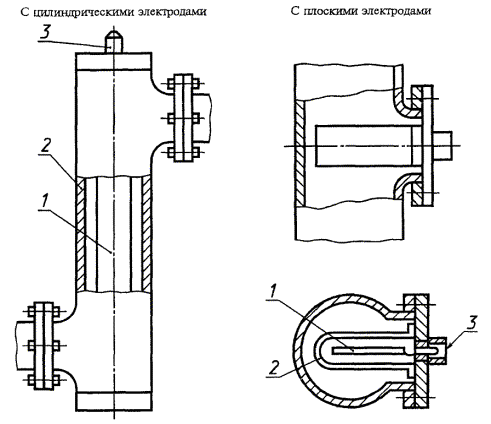 1 - внутренний электрод; 2 - внешний электрод; 3 - разъем для соединения с измерительным блоком Черт. 2* * Черт. 1. (Исключен, Изм. № 2). 2. ПРИБОРЫ И МАТЕРИАЛЫ2.1. Диэлькометрический метод осуществляется с применением влагомеров, состоящих из емкостных датчиков и измерительных блоков, преобразующих изменения электрической емкости датчика, вызываемые изменением влажности эмульсии, в выходной сигнал. (Измененная редакция, Изм. № 1). 2.2. (Исключен, Изм. № 2). 2.3. Применяют влагомеры с диапазонами измерения влажности: 0 - 0,75; 0 - 1,5; 0 - 3; 0 - 15; 0 - 60 % (по объему). Если для измерения влажности в общем потоке, представленном свободной водой и эмульсией, используют влагомер с диапазоном измерении 0 - 100 % (по объему), он дополняется усредняющим устройством. (Измененная редакция, Изм. № 1, 2). 2.4. Для измерения влажности нефти и нефтепродуктов должны использоваться влагомеры: с подстройкой на нефть с определенной диэлектрической характеристикой при измерении; с автоматической коррекцией влияния изменения диэлектрической характеристики нефти. (Измененная редакция, Изм. № 2). 2.5. (Исключен, Изм. № 2). 2.6. Влагомеры, измеряющие влажность нефти в потоке, должны соответствовать ГОСТ 22782.5-78. (Измененная редакция, Изм. № 1). 2.7. Основная приведенная погрешность влагомеров в зависимости от диапазонов измерения влажности не должна превышать значений, указанных в табл. 1а. Таблица 1а