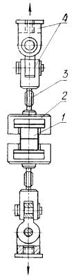 Постановлением Комитета стандартов, мер и измерительных приборов при Совете Министров СССР от 20 июня 1969 г. № 708 срок введения установлен с 01.01.70 Проверен в 1984 г. Постановлением Госстандарта от 19.12.84 № 4745 срок действия продлен до 01.07.95 Настоящий стандарт распространяется на клеи и устанавливает метод определения статической прочности при равномерном отрыве клеевых соединений при нормальной, пониженной и повышенной температурах (от минус 196 до плюс 1200 °С). Сущность метода заключается в определении величины разрушающей силы при растяжении стандартного образца клеевого соединения встык, усилиями, направленными перпендикулярно плоскости склеивания. Применение метода предусматривается в стандартах и технических условиях на продукцию, устанавливающих технические требования на нее. (Измененная редакция, Изм. № 1). 1. ОБОРУДОВАНИЕ ДЛЯ ИСПЫТАНИЯ1.1. Предел прочности при отрыве определяют на испытательной машине, позволяющей производить испытание на растяжение и измерять величину нагрузки с погрешностью не более 1 % от измеряемой величины. (Измененная редакция, Изм. № 1). 1.2. Испытания образцов производят в специальном приспособлении, установленном в губках испытательной машины. Схема приспособления приведена на черт. 1. Приспособление должно обеспечить центрирование образцов таким образом, чтобы линия действия растягивающих усилий совпадала с его продольной осью. 1 - образец; 2 - захват; 3 - тяга; 4 - шарнирная подвеска Черт. 1 1.3. Испытания при пониженной и повышенной температурах проводят на машинах, на которых проводят испытания при нормальной температуре, дополнительно оборудованных съемными охладительными или нагревательными камерами для нагрева или охлаждения испытуемых образцов, или на машинах, специально предназначенных для этих целей. 1.4. Испытание образцов производят в воздушной среде. Примечание. Допускается охлаждение образцов непосредственно в среде жидкого хладоагента (жидкий азот, смесь углекислоты со спиртом и др.), если хладоагент не оказывает физико-химического воздействия на испытуемый материал. 1.5. Нагревательная холодильная камера должна обеспечивать равномерное (нагревание) охлаждение образца до заданной температуры и сохранение последней на протяжении испытания, при этом допускаемые отклонения температуры образца от заданной не должны превышать: ± 2 °С - при температуре испытаний от минус 196 до плюс 200 °С; ± 3 °С - при температуре испытаний от плюс 200 до плюс 600 °С; ± 4 °С - при температуре испытаний от плюс 600 до плюс 900 °С; ± 6 °С - при температуре испытаний от плюс 900 до плюс 1200 °С. 1.6. Периодический контроль температуры испытуемого образца при повышенной и пониженной температурах осуществляют термопарой с потенциометром класса точности не ниже 0,5 по ГОСТ 9245-79, установленной непосредственно на образце вблизи клеевого шва. Измерение температуры производят по ГОСТ 6616-84: от минус 196 до плюс 400 °С термопарами медь-константан или хромель-копель; от плюс 400 до плюс 1100 °С термопарами хромель-алюмель; от плюс 1100 до плюс 1200 °С термопарами платино-платинородиевой. 2. ПОДГОТОВКА К ИСПЫТАНИЮ2.1. Образец, предназначенный для испытаний, склеивают из двух одинаковых частей. Форма и размеры образца приведены на черт. 2. Диаметры склеиваемых друг с другом половин образца не должны отличаться один от другого более чем на 0,1 мм. Взаимное