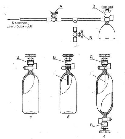 а - контейнер с одним вентилем; б - контейнер со сливной трубкой; в - контейнер с двумя вентилями; А - регулирующий вентиль; Б - продувочный вентиль; В - впускной вентиль; Г - сливная трубка; Д - выпускной вентиль Рисунок А. 1 - Контейнеры для проб и пробоотборная линия ПРИЛОЖЕНИЕ ББиблиография[1] ИСО 9162-88 Нефтепродукты. Топлива (класс F). Сжиженные нефтяные газы. Спецификация». (ИУС № 7 2000 г.)
