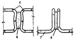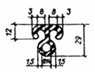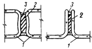 3.17. В ограждающих конструкциях профильное стекло крепится металлическими уголками или деревянными штапиками, длина которых для швеллерного и ребристого стекла, расположенного в один слой, должна быть не более 0,2 м, а в остальных случаях не более 1,5 м. 3.18. Стальные элементы обвязки и рамы стеклопанелей проектируются из холодногнутых профилей. Прогиб в плоскости остекленения элементов, на которые опирается профильное стекло, должен быть не более 15 мм. 3.19. Стеклопанели крепятся к несущим конструкциям зданий с помощью связей, обеспечивающих независимость их деформаций. 3.20. Стыки между элементами профильного стекла в конструкциях окон должны быть уплотнены резиновыми прокладками с обязательной двухсторонней герметизацией их мастиками (рис. 1). При применении прокладок «Бутэпрол» герметизация стыков мастиками не требуется.