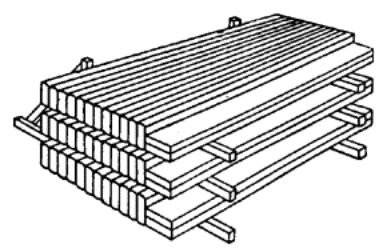 Рис.1. Стыки между элементами профильного стекла при заполнении оконных проемов 1 - профильное стекло; 2 - уплотнительная прокладка из резины; 3 - мастика; 4 - уплотнительная прокладка «Бутэпрол» 3.21. Стыки между элементами профильного стекла в конструкциях перегородок, к которым не предъявляются требования герметичности, допускается уплотнять прокладками из поливинилхлорида, губчатой резины и других эластичных материалов без промазки их мастикой. 3.22. В зенитных фонарях из профильного стекла под остеклением должно предусматриваться устройство защитных металлических сеток с ячейками размером не более 50´50 мм. 4. ИЗГОТОВЛЕНИЕ И МОНТАЖ4.1. В проекте производства работ по монтажу конструкций из профильного стекла в зависимости от принятого в рабочих чертежах способа сборки (поэлементной или стеклопанелями) должны быть определены участки складирования монтируемых элементов, места для выполнения подготовительных работ, приведена технологическая схема сборки стеклопанелей (при условии оборки их на стройплощадке), указаны подъемные механизмы, дан перечень монтажных приспособлений, лесов или подмостей, а также приведены основные правила техники безопасности производства работ. 4.2. Профильное стекло должно храниться под навесом в положении «на ребро», уложенным в штабели. При этом элементы швеллерного стекла складируются попарно, полками внутрь. Число рядов профильного стекла по высоте штабеля не должно превышать 4. Между отдельными рядами обязательна установка деревянных подкладок, располагаемых на расстоянии 1/4 длины элементов от их торцов. Для обеспечения устойчивости штабеля крапине два элемента профильного стекла укладывают плашмя с плотным прилеганием к соседним, размещенным «на ребро» (рис. 2).