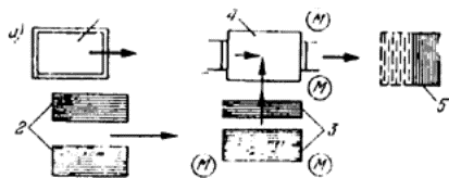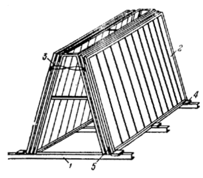 Рис. 3. Складирование стеклопанелей в пирамиде 1 - пирамида; 2 - стеклопанели; 3-скрутка; 4 - упор; 5 - подкладка 4.4. В состав основных работ по поэлементной сборке ограждающих конструкций из профильного стекла входит: подготовка элементов профильного стекла, установка их в проектное положение, герметизация стыков мастикой. 4.5. Перед подготовкой профильного стекла должны быть отбракованы элементы, имеющие трещины. 4.6. Подготовка профильного стекла предусматривает его очистку, заготовку и наклейку уплотнительных прокладок, складирование элементов в кассеты (рис. 4 и 5) для последующей подачи их к месту монтажа. В теплый период года подготовка элементов профильного стекла выполняется под навесом, а в холодный - в закрытых помещениях при температуре не ниже +5°С. 4.7. Перед наклейкой уплотнителей элементы профильного стекла раскладывают на столе-верстаке в положении «на ребро» и обезжиривают растворителем боковую поверхность. Прокладки из резины или поливинилхлорида протирают растворителем и без натяжения наклеивают на одну из боковых поверхностей элементов. Прокладки «Бутэпрол» наклеивают в следующей последовательности: снимают защитный слой бумаги, одну из поверхностей прокладок смачивают уайт-спиритом, после чего накладывают их на боковую поверхность профильного стекла, плотно прижимая прокатным роликом.