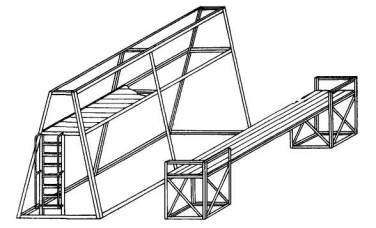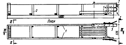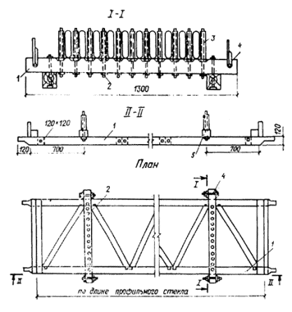 Рис. 4. Общий вид кассеты для подачи элементов профильного стекла на леса или подмости 1 - деревянная рама; 2 - болты-ограничители; 3 - резиновые трубки-насадки; 4 - монтажные петли; 5 - опорные брусья