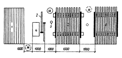 Рис. 6. Схема организации рабочего места при подготовке элементов к монтажу (в мм) 1 - элементы профильного стекла; 2 - щетки для очистки элементов; 3 - стол-верстак; 4 - уплотнительные прокладки; 5 - емкость с клеем; 6 - кассеты с подготовленными элементами профильного стекла; М - монтажники 4.8. Подготовку элементов профильного стекла рекомендуется выполнять звеном монтажников, состоящим из трех человек. Инструменты, приспособления, их назначение и количество на звено монтажников указаны в табл. 6, а схема организации рабочего места монтажников приведена на рис. 6.