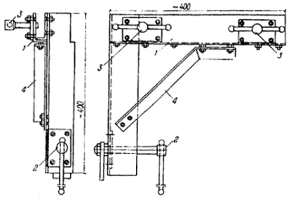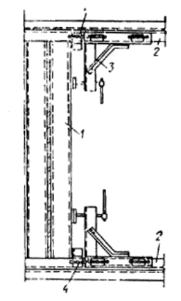 Рис. 5. Кассета монтажная для подачи элементов профильного стекла непосредственно в проем 1 - борт; 2 ‑ распорки; 3 - запорная планки; 4 - монтажная петля.
