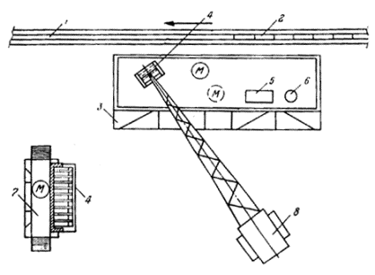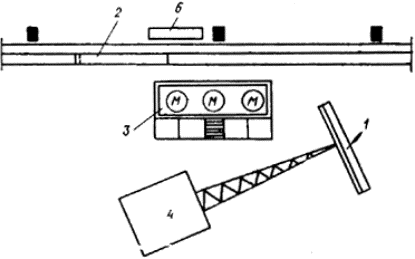 Рис. 14. Схема организации рабочего места монтажников (а) и последовательность изготовления панелей из профильного стекла 1 - складирование рам; 2 - складирование профильного стекла; 3 - верстак для подготовки профильного стекла; 4 - сборочный стенд; 5 - складирование готовых стеклоизделий; М - монтажники 4.20. В процессе монтажа стеклопанель подают к месту установки краном с помощью смобалансирующей траверсы. После установки и выверки проектного положения стеклопанель крепят к несущим конструкциям здания. 4.21. Работы по монтажу стеклопанелей с транспортных средств рекомендуется выполнять звеном монтажников из 3-5 человек. Схема организации рабочего места монтажников приведена на рис. 15, а необходимые механизмы, инструменты и приспособления - в табл. 11. Таблица 11