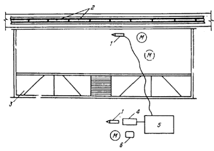 Рис. 11. Схема организации рабочего места монтажников при герметизации стыков 1 - пневмошприц; 2 - ограждение из профильного стекла; 3 - трубчатые леса; 4 - установка для заправки шприцов; 5 - компрессор; 6 - емкость с мастикой; М - монтажники