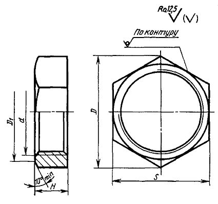 Дата введения 01.01.78 1. Настоящий стандарт распространяется на контргайки для резьбовых соединений трубопроводов общемашиностроительного применения. Все требования настоящего стандарта являются обязательными. Стандарт может быть использован для сертификации с объемами и методами сертификационных испытаний по ГОСТ 15763. (Измененная редакция, Изм. № 3). 2. Конструкция и основные размеры контргаек должны соответствовать указанным на чертеже и в таблице. Примечание. D1 = (0,9 ÷ 0,95) S. Размеры в мм