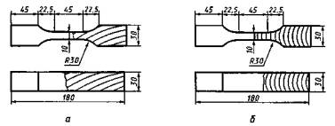 а - в тангентальном направлении, б - в радиальном направлении 2.2. Точность изготовления, влажность и количество образцов должны соответствовать требованиям ГОСТ 16483.0. 3. ПРОВЕДЕНИЕ ИСПЫТАНИЯ3.1. Толщину a и ширину b измеряют по середине длины образца с погрешностью не более 0,1 мм. В каждом образце должна быть определена кривизна годичных слоев в процентах, равная отношению стрелы дуги годичного слоя в середине рабочей части образца к хорде; длина хорды в тангентальных образцах должна быть равна 2 см, а в радиальных - толщине рабочей части образца. 3.2. Образец помещают в захваты так, чтобы к рифленым поверхностям захвата примыкали торцовые поверхности образца, причем часть каждой головки, граничащая с закруглением, оставалась свободной на протяжении около 10 мм, а растягивающая нагрузка совпадала с продольной геометрической осью образца. 3.3. Скорость испытания должна быть такой, чтобы образец разрушился в течение от 1,5 до 2 мин с момента нагружения. При использовании машин с электромеханическим приводом допускается проводить нагружение образца равномерно со скоростью (2500 ± 500) Н/мин или проводить испытание при скорости нагружения одной из нагружающих головок испытательной машины 4 мм/мин. 3.4. Испытания проводят до разрушения образца. Максимальную нагрузку определяют с точностью до цены деления шкалы силоизмерителя. Результаты испытаний образцов, разрушившихся не на рабочем участке, не учитывают. 3.5. Влажность образцов после испытания определяют по ГОСТ 16483.7. В качестве пробы для определения влажности берут среднюю часть образца длиной поперек волокон около 30 мм. Допускается определять влажность каждого второго образца. 3.3 - 3.5. (Измененная редакция, Изм. № 1). 4. ОБРАБОТКА РЕЗУЛЬТАТОВ4.1. Предел прочности (σW) образца с влажностью W в момент испытания вычисляют с точностью до 0,01 МПа по формуле