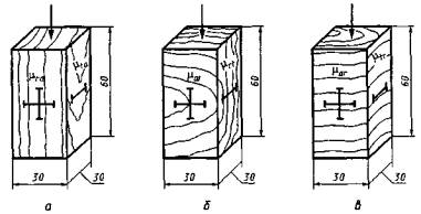 а - вдоль волокон; б - поперек волокон в тангентальном направлении; в - поперек волокон в радиальном направлении 3. ПРОВЕДЕНИЕ ИСПЫТАНИЯ3.1. В образцах для сжатия поперек волокон измеряют кривизну годичных слоев, которую определяют как отношение (в процентах) стрелы дуги годичного слоя, проходящего по середине образца, к хорде длиной 2 см. 3.2. Толщину и ширину образцов измеряют в случае определения на одном и том же образце коэффициентов поперечной деформации и модуля упругости, при этом измерение производят по середине длины образца с погрешностью не более 0,1 мм. 3.3. На боковых поверхностях каждого образца проводят осевые линии. На них на расстоянии 10 мм от точки пересечения намечают места установки ножек тензометров (см. чертеж). Под ножки тензометров наклеивают (клей БФ-2 по ГОСТ 12172) подкладки из латуни по ГОСТ 931 толщиной от 0,5 до 1,0 мм, размером 5´5 мм. 3.4. На каждом образце измерение деформации производят последовательно сначала в продольном, затем в поперечных направлениях, для чего на противоположных боковых сторонах образца устанавливают одновременно два тензометра, по одному на каждую сторону, и закрепляют струбциной. Расположение ножек тензометров должно строго соответствовать разметке. Правильность установки тензометров проверяют легким постукиванием пальца по образцу. При правильной установке освобожденная стрелка тензометра колеблется около одного и того же деления шкалы. 3.5. Усилие при испытании должно совпадать с продольной геометрической осью образца. Для измерения деформации в одном направлении каждый образец подвергают шестикратному нагружению на сжатие в пределах, указанных в таблице.