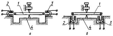 устройство; 7- образец с ферромагнитными пластинками (Измененная редакция, Изм. № 2). 2. ПОДГОТОВКА К ИСПЫТАНИЯМ2.1. Образцы изготовляют в форме прямоугольного бруска размерами 20´20´300 мм. Точность изготовления, влажность и количество образцов должны соответствовать требованиям ГОСТ 16483.0-89. (Измененная редакция, Изм. № 1, 2). 3. ПРОВЕДЕНИЕ ИСПЫТАНИЙ3.1. Ширину образца b в радиальном и высоту h в тангентальном направлениях измеряют на середине длины образца с погрешностью не более 0,1 мм. Длину образца l измеряют с погрешностью не более 1 мм. 3.2. Образец взвешивают с погрешностью не более 0,1 г. 3.3. На каждой боковой поверхности образца в точке пересечения диагоналей высверливают отверстие глубиной 7 - 8 мм и диаметром 0,8 мм под иглы опорного устройства. 3.4. На каждый образец прикрепляют по шесть ферромагнитных пластинок или пластинок из другого подобного материала: по одной на торцы при возбуждении продольных колебаний и по две на радиальную и тангентальную поверхности при возбуждении изгибных колебаний. Пластинки на торцах должны быть расположены в их центральной части, а на боковых поверхностях - на концах образца, так чтобы край пластинки совпадал с ребром торца. Рекомендуемые размеры пластинок 5´5 мм. Масса одновременно прикрепляемых пластинок не должна превышать 1 г. 3.5. Образец с пластинками взвешивают с погрешностью не более 0,1 г и закрепляют на опорном устройстве с помощью вертикальных игл диаметром 1 мм, длиной около 10 мм. 3.6. Для возбуждения продольных колебаний возбудитель и датчик подводят к торцам образца (см. черт. 2, а). Расстояние между образцом и возбудителем или датчиком не должно быть более 1 мм. Не допускается соприкосновение возбудителя или датчика с образцом. Схема расположения возбудителя и датчика при продольных и изгибных колебаниях
