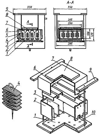 колпак; 8 - груз; 9 - ручка-опора; 10 - отверстие под иглу сосуд, жидкостный термостат и систему водопроводящих трубок, предназначенные для поддержания стабильной температуры. Отклонения от установленной температуры не должны превышать 0,1 °С; оборудование для определения влажности древесины - по ГОСТ 16483.7. 3. ПОДГОТОВКА К ИСПЫТАНИЮ3.1. Сорбционную камеру собирают в следующей последовательности: на основание ставят каркас, прокалывая батистовую ленту, которая зигзагообразно располагается в каркасе и образует четыре отсека, иглы с образцами вставляют в отверстие основания. При этом следят, чтобы стружки не касались батиста и стенок каркаса. Каркас закрывают четырьмя (по количеству отсеков) крышками и сверху надевают колпак с грузом. 4. ПРОВЕДЕНИЕ ИСПЫТАНИЙ4.1. Сорбционную камеру с образцами, подготовленную к испытанию как указано в п. 3.1, помещают в сосуд 1, свободный от воды (см. черт. 1). При закрытых кранах 4 и 5 и открытом кране 3 включают жидкостный термостат с дистиллированной водой. После этого сосуд заполняют водой (закрывают кран 3 и открывают краны 4 и 5) и одновременно доливают термостат до нормального уровня. При наличии воздуха под колпаком вода заливает только дно камеры, смачивая батист. Образцы оказываются расположенными в замкнутом пространстве, где через некоторое время воздух полностью насыщается влагой 4.2. На контактном термометре термостата устанавливают температуру (20 ± 0,5) °С. Мощность нагревательных элементов и количество воды, пропускаемой из водопровода через змеевик термостата, выбирают из расчета, чтобы соотношение между временем включенного состояния и временем отключенного состояния нагревательных элементов равнялось в среднем 0,6. (Измененная редакция, Изм. № 1). 4.3. Через четверо суток непрерывной работы установки удаляют воду из сосуда (закрывают краны 4 и 5 и открывают кран 3). Излишек воды из термостата сливают в запасной сосуд. 4.4. Сорбционную камеру вынимают из сосуда и снимают с нее колпак с грузом. Открывают крышку одного из отсеков камеры и осторожно, стараясь не замочить образец, вынимают одну из игл. Образец с нее быстро перекладывают в предварительно взвешенную бюксу. Затем вынимают последовательно все иглы с образцами. После удаления игл из отсека открывают следующий отсек и процесс повторяют. 4.5. Образцы, помещенные в бюксы, взвешивают и высушивают по ГОСТ 16483.7. 5. ОБРАБОТКА РЕЗУЛЬТАТОВ5.1. Влажность (W) в процентах вычисляют с округлением до 1 % по формуле