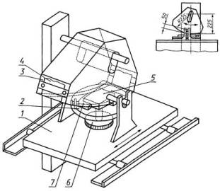 1 - подвижный стол; 2 - поворачивающийся диск; 3 - секторообразный груз; 4 - электрокорундовая шлифовальная шкурка; 5 - образец; 6 - храповой механизм; 7 - приспособление с упорами для закрепления образца Штангенциркуль с погрешностью измерения не более 0,1 мм по ГОСТ 166. Электрокорундовая шкурка по ГОСТ 5009, зернистость 25. Секундомер с погрешностью измерения не более 1 с. Весы с погрешностью взвешивания не более 0,01 г. Аппаратура для определения влажности по ГОСТ 16483.7. Разд. 2 . (Измененная редакция, Изм. № 1). 3. ПРОВЕДЕНИЕ ИСПЫТАНИЙ3.1. Испытание на истирание древесины проводят по поверхностям тангентального, радиального и поперечного разрезов древесины. 3.2. Высоту образца измеряют с погрешностью не более 0,1 мм. 3.3. Образец взвешивают с погрешностью не более 0,01 г. 3.4. Образец закрепляют на поворачивающемся диске машины, поджимая винтом подвижный упор приспособления. 3.5. На секторообразном грузе перемещают шлифовальную шкурку на длину изношенного участка с таким расчетом, чтобы каждый образец истирался новым участком шкурки. 3.6. Секторообразный груз опускают на образец и включают установку. При возвратно-поступательном движении стола подошва груза со шкуркой движется по поверхности образца, который дополнительно поворачивается на 36°. 3.7. Испытание образца заканчивают через 10 мин. 3.8. После испытания образец очищают от древесной пыли и взвешивают с погрешностью не более 0,01 г. 3.9. После испытания определяют влажность образцов по ГОСТ 16483.7. В качестве пробы на влажность берут весь образец. Минимальное количество испытываемых на влажность образцов должно соответствовать ГОСТ 16483.0. 4. ОБРАБОТКА РЕЗУЛЬТАТОВ4.1. Показатель истирания (t) образца в миллиметрах вычисляют по формуле