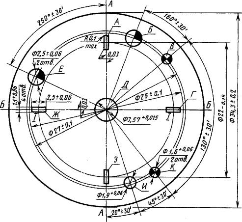 По требованию потребителя допускается изготовлять детали других габаритных групп и интервалов толщин. 2. ТЕХНИЧЕСКИЕ ТРЕБОВАНИЯ2.1. Детали должны соответствовать требованиям настоящего стандарта и изготовляться по чертежам, согласованным между изготовителем и потребителем и утвержденным в установленном порядке. При этом детали, вписываемые в окружность диаметром от 7 до 12 мм включительно, не должны иметь более четырех отверстий. 2.2. Допуски на размеры деталей, не нормированные чертежами, не должны быть более: смещение отверстий относительно осей симметрии ... ± 0,05 мм; отклонения от номинальных линейных размеров ... ± 0,1 мм; отклонения от номинальных угловых размеров: для углов 15 ° и менее ... ± 30'; для углов более 15 ° ... ± 45'. 2.3. Не допускаются закругления углов контура деталей радиусом более 0,2 мм и углов отверстий любой формы радиусом более 0,1 мм. 2.4. Разность толщин по недоснятию на детали не должна быть более 0,02 мм, при этом толщина детали не должна выходить за установленные пределы толщин. 2.5. Отклонения от нижнего предела интервала толщин не должны превышать 0,02 мм. В партии допускается не более 5 % деталей с такими отклонениями. Отклонения от верхнего предела интервала толщин не должны превышать 0,10 мм. В партии допускается не более 10 % деталей с такими отклонениями. 2.6. В партии деталей, имеющих отверстия с допуском не более ±0,03 мм, не допускается более 15 % деталей, в отверстия которых проходит калибр диаметром на 0,01 мм больше максимально допустимого диаметра отверстия или не проходит калибр диаметром на 0,01 мм меньше минимально допустимого диаметра отверстия. В партии деталей, имеющих отверстия с допуском более ±0,03 мм, не допускается более 3 % деталей с отверстиями таких размеров. 2.7. Детали должны соответствовать требованиям табл. 2. 2.8. В партии допускается не более 8 % деталей с отступлениями от требований пп. 2.1 (кроме требований к диаметру круглых отверстий и толщине), 2.2, 2.3, подпункта 8 табл. 2 и не более 6 % деталей с отступлениями от требований пп. 2.4 и 2.7 (кроме подпункта 8 табл. 2).