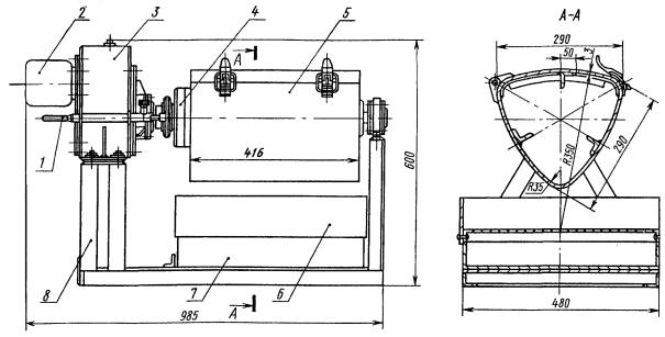 Дата введения 01.01.74 Настоящий стандарт распространяется на торфяные брикеты и полубрикеты и устанавливает метод определения механической прочности. Сущность метода заключается в механической обработке брикетов или полубрикетов во вращающемся барабане закрытого типа и последующем рассеве. 1. ОБОРУДОВАНИЕ1.1. Для проведения испытания применяют следующее оборудование: механическую установку МИБ, изготовленную по чертежам Калининского филиала Всесоюзного научно-исследовательского института торфяной промышленности (ВНИИТП), схема которой изображена на чертеже. 1 - ручка переключения муфты; 2 - электродвигатель; 3 - редуктор; 4 -муфта; 5 - барабан; 6 - сито; 7 - поддон; 8 - опорная рама Установка состоит из вращающегося стального барабана, имеющего в разрезе треугольную форму с выпуклыми поверхностями и тремя угловыми профилями внутри. Одна из поверхностей барабана съемная и является крышкой люка для загрузки и выгрузки барабана. Барабан снабжен электроприводом, обеспечивающим частоту вращения (25 ± 2) мин-1. На раме под барабаном размещается сито с металлической сеткой № 25-2.0 по ГОСТ 5336 и поддон. Допускается использовать установки других конструкций при соблюдении формы и размера барабана и частоты его вращения; секундомер для определения частоты вращения барабана; весы с погрешностью взвешивания не более 5 г. (Измененная редакция, Изм. № 1, 2). 2. ПРОВЕДЕНИЕ ИСПЫТАНИЯ2.1. Для испытания из отобранной по ГОСТ 13674 и ГОСТ 5396 и усредненной объединенной пробы набирают две пробы массой по (5 ± 0,25) кг каждая. (Измененная редакция, Изм. № 1). 2.2. Пробу брикетов или полубрикетов загружают в барабан, плотно закрывают крышку люка и включают электродвигатель. Барабан с пробой вращают в течение 10 мин, после чего электродвигатель отключают, открывают крышку люка и высыпают содержимое барабана на расположенное под ним сито. Не разрушившиеся брикеты или полубрикеты и крупные куски отбирают, а остаток на сите просеивают вручную. После рассева надрешетный продукт соединяют с ранее отобранными брикетами и кусками и взвешивают. 2.3. Все взвешивания производят с погрешностью не более 5 г. (Измененная редакция, Изм. № 2). 2.4. Испытанию в барабане подвергают две параллельные пробы. После испытания надрешетный и подрешетный продукты возвращают в объединенную пробу. (Измененная редакция, Изм. № 1). 3. ОБРАБОТКА РЕЗУЛЬТАТОВ3.1. На основании данных рассева рассчитывают содержание кусков размером более 25 мм, выраженное в процентах от массы загруженной пробы, которое и характеризует механическую прочность брикетов и полубрикетов на истирание (Пи). Механическую прочность (Пи) в процентах вычисляют по формуле