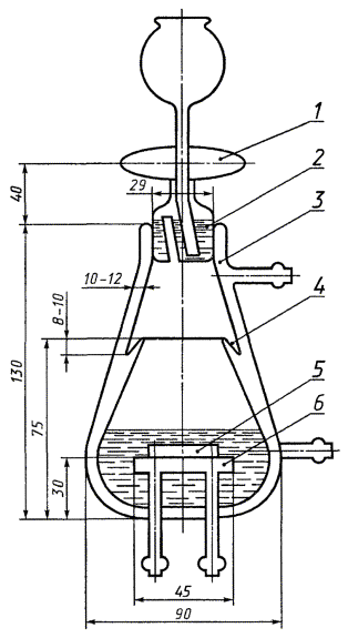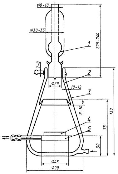 2.3. Подготовка образца топлива 2.3.1. Испытуемое топливо фильтруют через бумажный фильтр при комнатной температуре. 3. ПРОВЕДЕНИЕ ИСПЫТАНИЯ3.1. В нагретый прибор на стеклянную площадку помещают предварительно взвешенную пластинку с известной постоянной травления. Через воронку заливают от 60 до 70 см3 испытуемого топлива, подготовленного по п. 2.3 (пластинка должна быть полностью покрыта топливом), и в желобок заливают 5 см3 дистиллированной воды. (Измененная редакция, Изм. № 3). 3.2. Аппарат закрывают пробкой, в которую заливают дистиллированную воду, добавляя ее по мере испарения, и проводят испытание в течение 4 ч. Момент закрытия аппарата пробкой принимают за начало испытания. (Измененная редакция, Изм. № 2). 3.3. По истечении 4 ч обогрев отключают, пластинки вынимают из аппарата, охлаждают до комнатной температуры. После охлаждения пластинки промывают спиртобензольной смесью, протравливают, как указано в пп. 2.1.2 - 2.1.3, и взвешивают с погрешностью не более 0,0002 г. (Измененная редакция, Изм. № 1, 2). 4. ОБРАБОТКА РЕЗУЛЬТАТОВ4.1. Коррозионную активность топлив в условиях конденсации воды (К) в г/м2 вычисляют по формуле К = где m - масса пластинки до испытания, г; m1 - масса пластинки после испытания, г; h - постоянная травления, г; S - площадь верхней и боковой поверхностей пластинки (одна из поверхностей - нижняя не учитывается, так как прилегает к поверхности площадки и в процессах коррозии не участвует), м2. (Измененная редакция, Изм. № 2). 4.2. За результат испытания принимают среднее арифметическое результатов двух параллельных определений. 4.3. Сходимость метода Два результата определений, полученные одним исполнителем в одной лаборатории, признаются достоверными (с 95 %-ной доверительной вероятностью), если расхождение между ними не превышает 1 г/м2. (Измененная редакция, Изм. № 3). ПРИЛОЖЕНИЕАппарат для определения коррозионной активности бензинов1 - водяной холодильник; 2 - межстенное пространство; 3 - желобок; 4 - металлическая пластинка; 5 - стеклянная площадка для размещения металлической пластинки СОДЕРЖАНИЕ