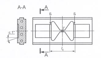 Г – центральный литник с диаметром со стороны сопла не менее 4 мм; Б – впускной литник; lс – расстояние между линиями, вдоль которых образцы для испытаний отрезаются от распределительных литников. Черт. 1 Чертеж оформляющей полости и литниковой системы литьевой формы для изготовления образцов типов 6, 7 (пластина D2)