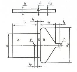 А – образец «пластина»; Б – впускной литник; В – разводящий литник; Г – центральный литник; Р – датчик давления; l – длина пластины; b – ширина пластины; h – толщина пластины; l1 – длина впускного литника; h1 – толщина впускного литника; l2 – длина разводящего литника; b2 – ширина разводящего литника; h2 – толщина разводящего литника; l3 – не регламентируется; lр – расстояние датчика давления (при наличии) от литника, lр=(5±2) мм при условии, что lр+rр£10 и lр-rр³10, где rр - радиус датчика давления l1=(4,0±0,1) мм h1=(1,5±0,1) мм l2=(25¸30) мм b2=(66±2) мм h2=(2,0±0,1) мм