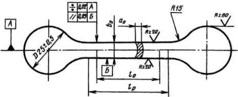 1.1.3. Цилиндрический образец (черт. 6). Цилиндрические образцы отбирают от труб с толщиной стенки 8,0 мм и более. Диаметр рабочей части цилиндрического образца устанавливают: