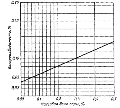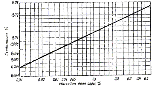 где V - объем 0,05 моль/дм3 (0,05 н.) раствора соляной кислоты, израсходованный на титрование контрольного опыта, см3; V1 - объем 0,05 моль/дм3 (0,05 н.) раствора соляной кислоты, израсходованный на титрование раствора после поглощения продуктов сгорания нефтепродукта, см3; К - поправочный коэффициент к титру 0,05 моль/дм3 (0,05 н.) раствора соляной кислоты; 0,0008 - масса серы, эквивалентная 1 см3 0,05 моль/дм3 (0,05 н.) раствора соляной кислоты, г; т - масса испытуемого продукта, г. (Измененная редакция, Изм. № 2). 4.2. За результат определения принимают среднее арифметическое двух параллельных определений. Черт 1 Черт 2 4.2, 4.3. (Измененная редакция, Изм. № 3). Два результата определений, полученных одним исполнителем в одной лаборатории, признаются достоверными (с 95 %-ной доверительной вероятностью), если расхождения между ними не превышают значений, указанных на черт. 1 (для массовой доли серы до 0,5 %) и 0,030 % - (для массовой доли серы свыше 0,5 %). 4.3. Два результата испытаний, полученных в двух разных лабораториях, признаются достоверными (с 95 %-ной доверительной вероятностью), если расхождения между ними не превышают значений, указанных на черт. 2 (для массовой доли серы до 0,5 %) и 0,030 % - (для массовой доли серы свыше 0,5 %). ИНФОРМАЦИОННЫЕ ДАННЫЕ 1. РАЗРАБОТАН И ВНЕСЕН Министерством нефтеперерабатывающей и нефтехимической промышленности СССР ИСПОЛНИТЕЛИ Е.М. Никоноров, д-р хим. наук; В.В. Булатников, канд. техн. наук; В.Д. Милованов, канд. техн. наук; Т.Г. Скрябина, канд. техн. наук; Л.А. Садовникова, канд. техн. наук; Л.Г. Нехамкина, канд. хим. наук (руководители темы); Т.Н. Чекмасова; Т.И. Довгополая 2. УТВЕРЖДЕН И ВВЕДЕН В ДЕЙСТВИЕ Постановлением Государственного комитета СССР по стандартам (№ 2121 от 10 августа 1973 г.) 3. Стандарт полностью соответствует СТ СЭВ 3361-81 4. ВЗАМЕН ГОСТ 1771-48 и ГОСТ 8657-57 5. ССЫЛОЧНЫЕ НОРМАТИВНО-ТЕХНИЧЕСКИЕ ДОКУМЕНТЫ