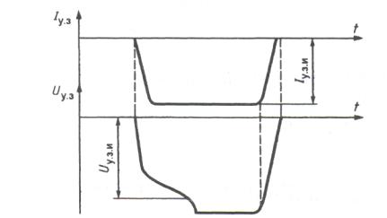 где Iо.с. - основной прямой ток, протекающий перед моментом переключения тиристора в закрытое состояние. (Измененная редакция, Изм. № 1, 2). 3.2. Диаграммы тока и напряжения приведены на черт. 2.
