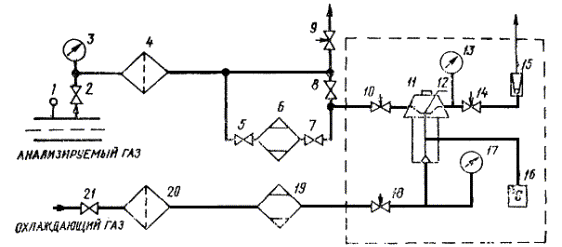 Постановлением Государственного комитета СССР по стандартам от 19 декабря 1984 г. № 4721 срок действия установлен с 01.01.86 до 01.01.92 Несоблюдение стандарта преследуется по закону Настоящий стандарт устанавливает метод определения точки росы углеводородов в природных газах, не содержащих капельных взвесей углеводородов и гликолей. Сущность метода заключается в измерении температуры начала конденсации углеводородов на поверхности охлаждаемого металлического зеркала при непрерывном потоке над ним предварительно осушенного анализируемого газа при фиксированном давлении. Стандарт полностью соответствует СТ СЭВ 4491-84. 1. МЕТОД ОТБОРА ПРОБПробу отбирают по ГОСТ 18917-82 из пробоотборной линии непосредственно в измерительный конденсационный прибор. Температура пробоотборной линии при измерении должна быть не ниже температуры газа в месте его отбора. Черт. 1 2. АППАРАТУРА, РЕАКТИВЫ И МАТЕРИАЛЫПрибор измерительный конденсационный, позволяющий измерять температуру точки росы газа при фактическом давлении анализируемого газа в пределах допускаемых расхождений по данному методу. Манометр с пределом измерения до 15 МПа, класса точности не ниже 1,0. Емкость для осушки газа из нержавеющей стали (черт. 1). Вентиль запорный игольчатый по ГОСТ 23230-78. Силикагель или молекулярные сита NaA (4A), NаХ (13Х); при использовании в качестве охлаждающего газа двуокиси углерода молекулярные сита не применяются. Магний хлорнокислый безводный (ангидрон), х. ч., или кальций хлористый гранулированный безводный, х. ч., по ГОСТ 4460-77 Вата из стекловолокна. Растворители: четыреххлористый углерод или этиловый спирт ректификованный технический по ГОСТ 18300-72 или спирт этиловый технический по ГОСТ 17299-78. Хладагенты: двуокись углерода жидкая по ГОСТ 8050-76 или газы углеводородные сжиженные, или термический охлаждающий элемент. 3. ПОДГОТОВКА К ИСПЫТАНИЮ3.1. Собирают аппаратуру по схеме (черт. 2). 3.2. При необходимости на линии охлаждающего газа устанавливают емкость для осушки, заполненную молекулярными ситами или силикагелем, а на линии контролируемого газа - емкость, заполненную безводным хлористым кальцием, который применяют в качестве осушителя, если температура точки росы углеводородов не ниже минус 10 °С, или хлорнокислым магнием при измерении более низких значений температуры точки росы углеводородов (до минус 30 °С). 3.3. Емкость для осушки промывают растворителем, сушат, затем заполняют осушителем. Снизу и сверху осушителя помещают металлическую сетку и вату из стекловолокна. 3.4. При проверке степени насыщения осушителя влагой точка росы инертного газа или воздуха, пропущенного через осушитель, не должна быть ниже измеряемой температуры точки росы углеводородов. 3.5. Для повторного использования хлористый кальций регенерируют прокаливанием. Хлорнокислый магний после насыщения влагой заменяют новым. Повторное использование его не допускается. 1 - термометр; 2, 5, 7, 8, 9, 10, 14, 18, 21 - вентили; 3, 13, 17 - манометры; 4, 20 - фильтры; 6, 19 - осушители; 11 - измерительная камера; 12 - измерительное зеркало; 15 - ротаметр; 16 - указатель температуры зеркала Черт. 2 3.6. Перед измерением газовые линии прибора и пробоотборные линии проверяют на герметичность способом мыльной пленки или по падению давления. Система считается герметичном, если на каждые 1000 кПа давления при закрытых вентилях на входе и выходе 
