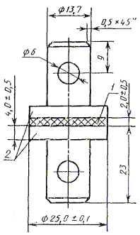 1 - резина; 2 - металлические диски Черт. 2 Пункт 2.11.12. Первый абзац дополнить словами: «Допускается выдерживать образцы при температуре (27 ± 2) °С»; второй абзац. Заменить слова: «на продукцию» на «на клей, резину или изделие». (ИУС № 11 1989 г.) |
