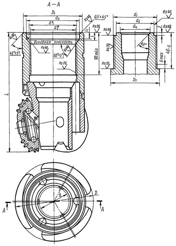 изготовлять головки с наружным диаметром D = 139,7 - 215,9 мм с пред. откл. Пример условного обозначения бурильной головки для керноприемных устройств без съемного керноприемника (К) с наружным диаметром D = 139,7 мм, внутренним диаметром d = 52 мм для бурения мягких пород: К139,7/52 М ГОСТ 21210-75 (Измененная редакция, Изм. № 1, 2). 4. Основные размеры бурильных головок для керноприемных устройств со съемным керноприемником должны соответствовать указанным на черт. 2 и в табл. 3. * Размеры для справок. Примечание. Чертеж не определяет конструкцию головки. Таблица 3 Размеры в мм