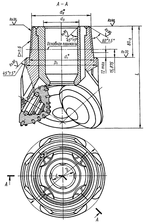 Примечание. По нормативно-технической документации, утвержденной в установленном порядке, до 01.01.80 допускалось изготовлять головки диаметрами D = 190; 214; 243; 269; 295 мм. Пример условного обозначения бурильной головки для керноприемных устройств со съемным керноприемником (КС) с наружным диаметром D = 187,3 мм, внутренним диаметром d = 40 мм для бурения пород средней твердости: КС 187,3/40 СЗ ГОСТ 21210- 75 (Измененная редакция, Изм. № 1). 5. Размеры профиля правой конической резьбы должны соответствовать указанным на черт. 3 и в табл. 4. Таблица 4 Размеры в мм