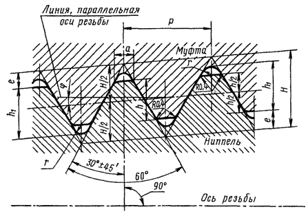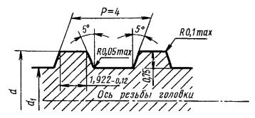 Примечания: 1. Шаг резьбы измеряется параллельно оси резьбы головки. 2. Размеры а и r даны для проектирования резьбообразующего инструмента. 6. Размеры профиля правой цилиндрической резьбы должны соответствовать указанным на черт. 4 и в табл. 5. Таблица 5 Размеры в мм