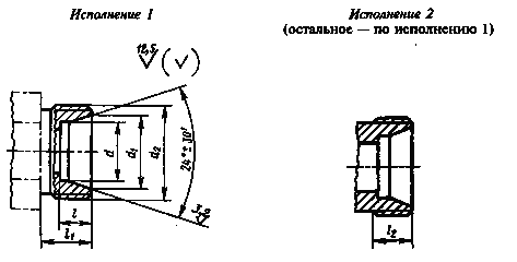 Дата введения 01.01.79 1. Настоящий стандарт распространяется на концы корпусных деталей с углом конуса 24е соединений трубопроводов, арматуры и гидро-пневмооборудования и на концы корпусных деталей для соединений с развальцовкой трубы с углом конуса 74° под накидные гайки. Обязательные требования к качеству продукции, обеспечивающие ее безопасность для жизни, здоровья и охрану окружающей среды, изложены в пп. 2, 3, 6 и 7 настоящего стандарта. (Измененная редакция, Изм. № 3). 2. Конструкция и основные размеры концов корпусных деталей с углом конуса 24° должны соответствовать указанным на черт. 1 и в табл. 1, концов корпусных деталей для соединений с врезающимся кольцом при радиальном монтаже - указанным на черт. 2 и в табл. 1, концов корпусных деталей для соединений с развальцовкой трубы - указанным на черт. 3 и в табл. 2. Концы корпусных деталей с углом конуса 24°
