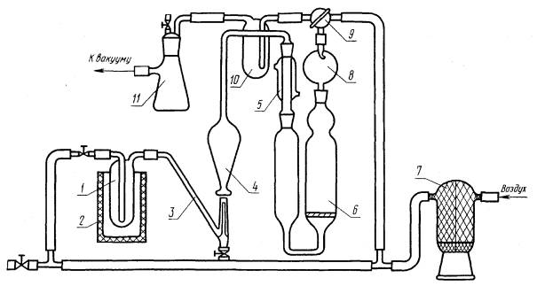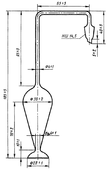 Постановлением Государственного комитета стандартов Совета Министров СССР от 22 февраля 1978 г. № 517 дата введения установлена Ограничение срока действия снято по протоколу № 3-93 Межгосударственного Совета по стандартизации, метрологии и сертификации (ИУС 5-6-93) *Издание (декабрь 2000 г. ) с Изменениями № 1, 2, утвержденными в январе 1984 г., декабре 1988 г. ( ИУС 5-84, 4-89) Настоящий стандарт распространяется на сжиженные углеводородные газы, широкую фракцию легких углеводородов, а также пентановые фракции и устанавливает метод определения общей серы при ее массовой доле 0,001 % и выше. Сущность метода заключается в сжигании пробы в точке воздуха и последующем нефелометрическом определении образовавшейся серной кислоты. 1. АППАРАТУРА, РЕАКТИВЫ И МАТЕРИАЛЫ1.1. Установка для сжигания анализируемого продукта (черт. 1), содержащая: ампулы из термостойкого стекла (пирекс) вместимостью 20 и 50 см3 (черт. 2, 3); сосуд Дьюара или фарфоровый толстостенный стакан вместимостью 250 - 500 см3; горелку стеклянную из пирекса (черт. 4); стекло ламповое из пирекса или кварцевого стекла (черт. 5); холодильник ХПТ-1-300-14/23 ХС по ГОСТ 25336-82 или аналогичного типа; аппараты для определения содержания серы в нефтепродуктах (абсорбер, каплеуловитель, лампочка с колпачком); 1 - ампула; 2 - сосуд Дьюара; 3 - горелка; 4 - ламповое стекло; 5 - холодильник; 6 - абсорбер; 7 - склянка для очистки воздуха; 8 - каплеуловитель; 9 - трехходовой кран; 10 - ловушка; 11 - предохранительная колба Ампула вместимостью 20 см3 Ампула вместимостью 50 см Стеклянная горелка Ламповое стекло краны соединительные стеклянные общего назначения по ГОСТ 7995-80; колба 1-500, 2-500 по ГОСТ 25336-82; насос водоструйный по ГОСТ 25336-82. Спиртовка СЛ-1 по ГОСТ 25336-82 или аналогичного типа. Склянка СПТ по ГОСТ 25336-82 или аналогичного типа. Колба 2-50-2, 2-100-2, 2-250-2, 2-1000-2 по ГОСТ 1770-74. Цилиндр 1-10, 1-50 по ГОСТ 1770-74. Пипетки 2-2-5, 2-2-10, 2-2-25, 4-2-1, 4-2-2, 5-2-1, 5-2-2, 6-2-5, 6-2-10, 7-2-5, 7-2-10 по ГОСТ 29227-91. Бюретки 6-2-2, 6-2-5 или 7-2-3, 7-2-10 по ГОСТ 29251-91. Стаканы типа В-1-100 по ГОСТ 25336-82. Колбы типов Кн-2-100, Кн-2-250, Кн-2-500 по ГОСТ 25336-82. Сетки металлические проволочные по ГОСТ 2715-75. Сетки тканевые гладкие с квадратными и прямоугольными ячейками, мелкие, нормальной плотности, из термически обработанной медной, латунной или стальной нержавеющей проволоки/ Вентиль редукционный или игольчатый. Воронки типа ВПр-1 по ГОСТ 25336-82. Трубки медицинские резиновые или трубки резиновые технические, диаметром 6 - 8 мм. Пробоотборник по ГОСТ 14921-78. Колориметр (нефелометр) фотоэлектрический типа ФЭК-56М или любого другого типа, аналогичного по чувствительности. Мешалка магнитная типа ММ-2 или аналогичного типа. Весы лабораторные общего назначения по ГОСТ 24104-88: с максимальным пределом взвешивания 200 г, с ценой деления не более 0,0001 г не ниже 2-го класса точности; с максимальным пределом взвешивания 1000 г, с ценой деления не более 0,1 г. Зажимы металлические винтовые и пружинные. Секундомеры механические или аналогичного типа. Термометры стеклянные по ГОСТ 400-80, типа ТН-8. Водорода перекись по ГОСТ 10929-76, х. ч. или ч. д. а., раствор с массовой долей 3 %. Спирт этиловый ректификованный технический по ГОСТ 18300-87 или спирт этиловый технический по ГОСТ 17299-78 марки А. Вода дистиллированная по ГОСТ 6709-72. Методы приготовления вспомогательных реактивов и растворов, применяемых в анализе по ГОСТ 4517-87. Вода дистиллированная, дважды перегнанная (бидистиллят) или де