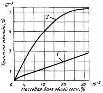 За результат испытания при массовой доле общей серы от 0,001 % до 0,030 % принимают среднее арифметическое двух определений серы из двух аликвотных частей одного поглотительного раствора, вычисленных с точностью до второго десятичного знака. (Измененная редакция, Изм. № 2). 5.4. Сходимость Два результата испытания, полученные одним исполнителем, признаются достоверными (с 95 %-ной доверительной вероятностью), если расхождение между ними не превышает значения, указанного на черт. 6 для большего результата при массовой доле серы от 0,001 % до 0,030 %. 5.5. Воспроизводимость Два результата испытаний, полученные в двух разных лабораториях, признаются достоверными (с 95 %-ной доверительной вероятностью), если расхождение между ними не превышает значения, указанного на черт. 6 для большего результата при массовой доле серы от 0,001 % до 0,030 %. Зависимость точности от массовой доли общей серы 1 - сходимость; 2 - воспроизводимость Черт. 65.4, 5.5. (Введены дополнительно, Изм. № 2). СОДЕРЖАНИЕ1. АППАРАТУРА, РЕАКТИВЫ И МАТЕРИАЛЫ... 1