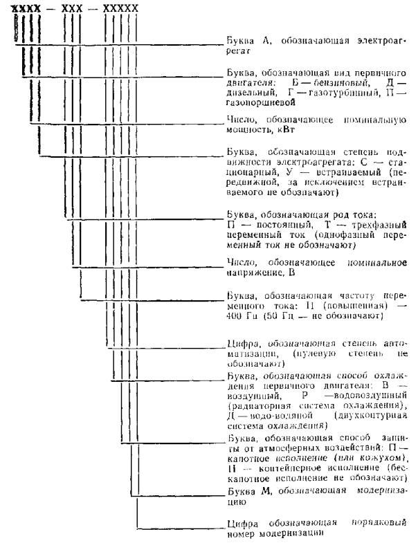 Постановлением Государственного комитета стандартов Совета Министров СССР от 2 июня 1978 г. № 1511 срок действия установлен с 01.07 1979 г. до 01.07 1987 г. Несоблюдение стандарта преследуется по закону 1. Настоящий стандарт распространяется на передвижные и стационарные электроагрегаты и на передвижные электростанции с двигателями внутреннего сгорания (далее - электроагрегаты и электростанции) и устанавливает систему их условных обозначений. Стандарт не распространяется на судовые, тепловозные, сварочные электроагрегаты, электроагрегаты летательных аппаратов и энергопоезда. Условные обозначения, установленные настоящим стандартом, не должны применяться вместо кодов Общесоюзного классификатора продукции и обозначений, принятых в стандартах Единой системы конструкторской документации. 2. Система условных обозначений электроагрегатов и электростанций состоит из буквенно-цифровых групп, разделенных дефисами и расположенных в порядке, установленном настоящим стандартом. Отличительные признаки электроагрегатов и электростанций, использованные в системе условных обозначений, соответствуют классификации электроагрегатов и электростанций по ГОСТ 23377-84. Термины и определения, применяемые в настоящем стандарте - по ГОСТ 23375-83. 3. Структура системы условных обозначений электроагрегатов