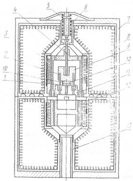 1.3. Для испытания берут не менее трех образцов. 2. АППАРАТУРА, МАТЕРИАЛЫ И РЕАКТИВЫ2.1. Аппаратура, материалы, реактивы по ГОСТ 23630.1-79 разд. 2. При этом применяют: прибор ИТ-l-400 (черт. 2 - 3), основой которого является l калориметр; 1 - тепломер; 2 - термопара; 3 - адиабатная оболочка; 4 - прижим; 5 - пружина; 6 - входной патрубок; 7 - корпус; 8 - теплозащитная оболочка; 9 - стержень; 10 - образец; 11 - основание; 12 - нагревательный блок; 13 - выходной патрубок Черт. 3 образец, диаметром 15±0,3, высотой 5±0,1 мм из меди марки m1 по ГОСТ 859-78 (СТ СЭВ 226-75) для градуировки прибора (см. обязательное приложение 1, 3); образцовые меры теплопроводности из кварцевого оптического стекла марки KB по ГОСТ 15130-69 или полиметилметакрилата для поверки прибора (см. обязательное приложение 2, 3). 3. ПОДГОТОВКА К ИСПЫТАНИЮ3.1. Образец взвешивают с погрешностью не более 0,001 г, измеряют высоту и диаметр образца с погрешностью не более 0,01 мм. 3.2. Контактные поверхности образца, основания и стержня (см. черт. 3) протирают бензином (спиртом), затем на них наносят тонкий слой кремнийорганической жидкости марки ПФМС-4, если в нормативно-технической документации на пластмассу нет иных указаний. 3.3. Испытуемый образец устанавливают в прибор на тепломер, затем опускают стержень, прижимая его прижимом и пружиной, и закрывают калориметр. 4. ПРОВЕДЕНИЕ ИСПЫТАНИЯ4.1. Проведение испытания по ГОСТ 23630.1-79, разд. 4. При этом металлическое ядро калориметра состоит из нагревательного блока, основания, тепломера, стержня из меди и адиабатной оболочки (см. черт. 3.) При нагреве через каждые 25 °С (температура стержня) измеряют перепады температуры на образце и на тепломере, пропорциональные числу делений шкалы гальванометра. 5. ОБРАБОТКА РЕЗУЛЬТАТОВ5.1. Теплопроводность образцов (l) в Вт/мК для каждой температуры вычисляют по формуле
