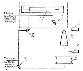 1.1, 1.2. (Измененная редакция, Изм. № 1). 2. ТРЕБОВАНИЯ БЕЗОПАСНОСТИ2.1. Газообразный азот не токсичен и не взрывоопасен. 2.2. При работе с газообразным азотом необходимо руководствоваться «Правилами устройства и безопасной эксплуатации сосудов, работающих под давлением», утвержденными Госгортехнадзором СССР 19.05.70, а также соблюдать требования ГОСТ 12.1.005-76 и ГОСТ 12.1.007-76. (Измененная редакция, Изм. № 1). 3. ПРАВИЛА ПРИЕМКИ3.1. Газообразный азот принимают партиями. Партией считают количество продукции, полученной в результате одного технологического цикла, массой не менее 100 г и оформленное документом о качестве. 3.2. Каждую партию продукции подвергают проверке на соответствие требованиям разд. 1. Для проверки от партии отбирают 5 ампул с пробой, две из которых вместимостью по 70 см3, три - по 10 см3. (Измененная редакция, Изм. № 1). 3.3. Партию продукции считают пригодной, если в результате анализа все требования, предъявляемые к ней, соответствуют настоящему стандарту. 3.4. При получении неудовлетворительных результатов анализа хотя бы по одному из показателей партию передают на переработку. После переработки партию вторично предъявляют на анализ. Результаты повторного анализа являются окончательными и распространяются на всю партию. 4. МЕТОДЫ АНАЛИЗА4.1. Отбор проб 4.1.1. Пробы для анализа отбирают из емкости с готовой продукцией. Схема отбора проб представлена на черт. 1. Схема установки отбора пробы 1 - вакуумметр; 2 - манометрический преобразователь; 3 - мановакуумметр; 4, 6, 9 - вентили; 5 - ампулы с пробой для определения атомной доли изотопа азот-15; 7 - ампулы с пробой для определения массовой доли азота, окиси азота и кислорода; 8 - вакуумные шланги (Измененная редакция, Изм. № 2). 4.1.2. Для определения атомной доли изотопа азот-15 пробу отбирают в три ампулы 5 вместимостью 10 см3 каждая. Для определения массовой доли азота, окиси азота и кислорода отбирают пробу в две ампулы 7 вместимостью 70 см3 каждая. Для этого открывают вентиль 9 и откачивают систему до остаточного давления 13∙10-2-13∙10-3 Па. Давление контролируют вакуумметром 1 (например, типа ВИТ-2А), включенным в систему через манометрический преобразователь 2 типа ПМТ-2. При достижении указанного выше остаточного давления закрывают вентиль 9 и оставляют систему для проверки на герметичность. Систему считают герметичной, если показание вакуумметра через 1 ч будет не более 2∙10-3 Па. После этого открывают вентиль 4 и заполняют ампулы 5 и 7 пробой под давлением 5∙104 Па. Давление газа контролируют мановакуумметром 3 (например, типа ОБМВ-160). Заполнив ампулы, вентиль 4 перекрывают. (Измененная редакция, Изм. № 2). 4.1.3. Ампулы 5 отпаивают при помощи газовой горелки, а ампулы 7 снимают с вакуумных шлангов. Затем ампулы маркируют, указывают номер партии и дату отбора пробы. (Измененная редакция, Изм. № 2). Допускается применение других методов отбора проб, исключающих разбавление продукта. 4.2. Определение внешнего вида 4.2.1. Внешний вид газообразного азота в ампуле определяют визуально. 4.3. Определение атомной доли изотопа азот-15 (масс-спектрометрический метод) 4.3.1. Аппаратура, приборы, реактивы Масс-спектрометр МИ-1201 или любой другой с разрешающей способностью не менее 200. Вакуумметр ВИТ-2 или ВИТ-1А-П, обеспечивающий измерение предварительного разрежения в диапазоне давлений 0,1-10,0 Па и диапазоне остаточного давления 10-2-10-5 Па. Комплект