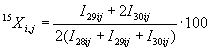 где I28ij; I29ij; I30ij - интенсивности пиков токов, образованных ионами с массовыми числами 28, 29, 30 соответственно, пА, которые вычисляют по формуле