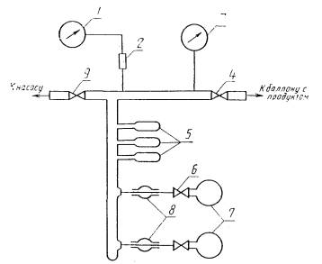 Изменение № 2 ГОСТ 23644-79 Азот газообразный, обогащенный стабильным изотопом азот-15. Технические условия Утверждено и введено в действие Постановлением Государственного комитета СССР по стандартам от 21.02.89 № 288 Дата введения 01.07.90 Вводная часть. Третий абзац изложить в новой редакции: «Молярная масса (по международным атомным массам 1973 г.) в зависимости от атомной доли изотопа азот-15 - от 28,20 г/моль до 29,98 г/моль»; дополнить абзацем (после третьего): «Марки и пример записи при заказе продукта - по ГОСТ 26335-84». Пункт 4.1.1. Чертеж 1 заменить новым: Схема установки отбора пробы 1 - вакуумметр; 2 - манометрический преобразователь; 3 - мановакуумметр; 4, 6, 9 - вентили; 5 - ампулы с пробой для определения атомной доли изотопа азот-15; 7 - ампулы с пробой для определения массовой доли азота, окиси азота и кислорода; 8 - вакуумные шланги Пункт 4.1.2 изложить в новой редакции: «4.1.2. Для определения атомной доли изотопа азот-15 пробу отбирают в три ампулы 5 вместимостью 10 см3 каждая. Для определения массовой доли азота, окиси азота и кислорода отбирают пробу в две ампулы 7 вместимостью 70 см3 каждая. Для этого открывают вентиль 9 и откачивают систему до остаточного давления 13∙10-2-13∙10-3 Па. Давление контролируют вакуумметром 1 (например, типа ВИТ-2А), включенным в систему через манометрический преобразователь 2 типа ПМТ-2. При достижении указанного выше остаточного давления закрывают вентиль 9 и оставляют систему для проверки на герметичность. Систему считают герметичной, если показание вакуумметра через 1 ч будет не более 2∙10-3 Па. После этого открывают вентиль 4 и заполняют ампулы 5 и 7 пробой под давлением 5∙104 Па. Давление газа контролируют мановакуумметром 3 (например, типа ОБМВ-160). Заполнив ампулы, вентиль 4 перекрывают». Пункт 4.1.3. Первый абзац изложить в новой редакции: «Ампулы 5 отпаивают при помощи газовой горелки, а ампулы 7 снимают с вакуумных шлангов. Затем ампулы маркируют, указывают номер партии и дату отбора пробы». Пункт 4.3.1. Исключить слова: «по ГОСТ 6616-74»; дополнить абзацем: «Линейка измерительная по ГОСТ 427-75». Пункт 4.3.4. Первый абзац. Экспликацию после слова «соответственно» дополнить словами: «пА, которые вычисляют по формуле