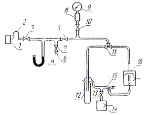 4.4.2. Подготовка к анализу Синтетический цеолит измельчают в фарфоровой ступке и отсеивают на сите порошок дисперсностью 0,25-0,50 мм. Взвешивают порошок массой 10 г с погрешностью ± 0,01 г, помещают в фарфоровую чашку, промывают дистиллированной водой для удаления пыли, высушивают в электропечи в течение 4 ч при температуре не более 380 °С и охлаждают в эксикаторе. Наполнение хроматографической колонки, подсоединение к хроматографу, включение хроматографа и подготовку его к работе проводят в соответствии с инструкцией предприятия-изготовителя. Режим работы хроматографа Вид адсорбента - синтетический цеолит.......................................................... СаА Длина колонки, мм.............................................................................................. 3000 Диаметр колонки, мм.......................................................................................... 3 Температура колонки, °С.................................................................................... 50 Скорость газа-носителя, см3/мин....................................................................... 60 Скорость движения диаграммной ленты, мм/ч................................................ 60 Сила тока детектора, мА..................................................................................... 120. 4.4.3. Проведение анализа Анализ проводят на установке, схема которой представлена на черт. 3. Ампулу с пробой подсоединяют к отростку 6. В начальном положении все краны установки, кроме крана 13, должны быть закрыты. Включают насос предварительного разрежения 14 и через 2-3 мин открывают краны 3, 5, 7, 10, выдвигают шток дозирующего элемента 2 и откачивают воздух до остаточного давления 13,3 Па. Давление измеряют вакуумметром 9. Затем при помощи кранов 11 и 15 включают парортутный насос 16 и откачивают воздух из установки до остаточного давления 1,33∙10-3 Па. Проверяют герметичность установки. Для этого закрывают последовательно краны 3, 5, 7, 10. При помощи кранов 11 и 15 отключают парортутный насос 16. Оставляют в течение 1 ч. Затем открывают последовательно краны 3, 5, 7, 10. Если показание вакуумметра 9 не меняется, установку считают герметичной. Перекрывают краны 5, 10, открывают кран ампулы с пробой. При этом изменяемая смесь наполняет петлю дозирующего элемента 2, к этому времени на диаграмме регистрируется нулевая линия, соответствующая чистому газу-носителю. Шток дозирующего элемента 2 переводят в исходное положение. При этом измеряемая проба поступает в хроматограф. Схема вакуумная установки для ввода газообразной пробы в хроматограф 1 - хроматограф; 2 - дозирующий элемент хроматографа; 3, 5, 7, 10, 13 - краны двухходовые; 4 - манометр ртутный; 6 - отросток для присоединения ампулы с пробой; 8 - манометрический преобразователь; 9 - вакуумметр; 11, 15 - краны трехходовые; 12 - ловушка; 14 - насос предварительного разряжения; 16 - парортутный насос Одновременно засекают время на секундомере и через 10-15 с регистрируют время выхода пиков (см. табл. 2). Типовые хроматограммы приведены на черт. 4 и 5». Пункт 4.4.4. Формулу расчета Xi изложить в новой редакции: