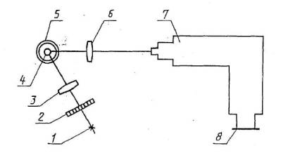 1 - источник возбуждение люминесценции; 2 - светофильтр; 3 - конденсор (F = 75-100 мм); 4 - пробирка с экстрактом или раствором сравнения бенз-a-пирена; 5 - прозрачный сосуд Дьюра с жидким азотом; 6 - конденсор (F = 94 мм), фокусирующий люминесцентное излучение на щель спектрографа; 7 - спектрограф с камерой (F = 120 мм); 8 - кассета с фотопленкой По схеме собирают установку и подготавливают ее к испытанию. На спектрографе устанавливают камеру с фокусным расстоянием F = 120 мм. Юстируют прибор в соответствии с инструкцией по эксплуатации спектрографа типа ИСП-51. Барабан длин волн устанавливают на деление 6,9. Устанавливают на рельсе спектрографа конденсор 6 на расстоянии около 18,5 см от щели спектрографа. Прозрачный стеклянный сосуд Дьюара укрепляют на лапке штатива Бунзена (на железную лапку предварительно надевают резиновые трубки для предохранения сосуда) и устанавливают над рельсом спектрографа так, чтобы его ось находилась в вертикальной плоскости, проходящей через главную оптическую ось прибора. При этом верхний край сосуда Дьюара должен находиться над рельсом на высоте (34±2) см. Сосуд Дьюара закрывают корковой пробкой с отверстиями, поворачивая ее так, чтобы центр отверстия для пробирки находился на вертикальной плоскости, проходящей через главную оптическую ось спектрографа. Центр конденсора 6 и нижняя часть пробирки должны быть на главной оптической оси спектрографа. Расстояние от оси пробирки до центра конденсора 6 - 18,5 см. Дополнительный рельс устанавливают под углом 60 °С к рельсу спектрографа и укрепляют на нем в стойке лампу типа ПРК-2 с кожухом в вертикальном положении. Расстояние от лампы до оси пробирки (33±2) см. Вентилятор устанавливают так, чтобы поток воздуха охлаждал кожух лампы и стеклянный сосуд Дьюара с азотом. Конденсор 3 устанавливают в стойке на дополнительном рельсе так, чтобы свет от источника фокусировался на пробирке с образцом. Центр выходного отверстия кожуха лампы и нижняя часть пробирки должны находиться на главной оптической оси конденсора 3. При применении лампы типа ПРК-2 питание ее осуществляется от сети 220 В через распределительную доску ЭПС-109, имеющуюся в комплекте спектрографа. 3.4.3.4. Подготовка установки В полностью затемненном помещении кассету заряжают пленкой. Для этого металлическую рамку (черт. 1) помещают в нижнюю часть кассеты (центральным углублением вверх). Отрезают пленку по размеру пластинки 88×36 мм и помещают пленку в углубление металлической рамки эмульсией вниз, накладывая сверху пластинку. На первую пластинку накладывают вторую пластинку из гетинакса размером 88×64 мм, закрывают кассету и устанавливают ее на спектрографе. Ртутно-кварцевую лампу включают за 15 мин до начала испытания, одновременно включают вентилятор для ее охлаждения. Проверяют правильность сборки установки по черт. 2. 3.4.4. Проведение испытания В чистую пробирку взвешивают с погрешностью не более 0,01 г стружку парафина массой 1,0 г, снятую не менее чем с трех-четырех различных мест образца, и заливают 4 см3 н-октана. Пробирку встряхивают в руке при 20-22 °С в течение 10 мин и после отстаивания экстракт масел и ароматических углеводородов в н-октане отделяют от осевшего парафина декантацией в чистую пробирку. В другую такую же пробирку с помощью пипетки с грушей отбирают 3 см3 раствора сравнения бенз-a-пирена 1·10-10 г/см3. Прозрачный сосуд Дь