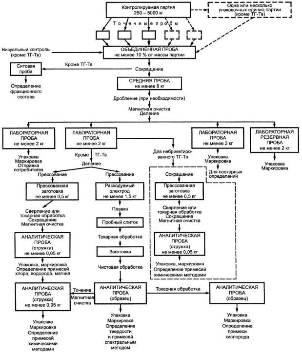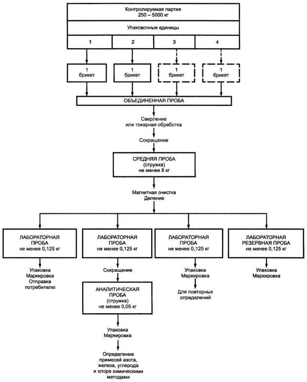Дата введения 2000-07-01 1 Область примененияНастоящий стандарт устанавливает методы отбора и подготовки проб для контроля качества губчатого титана, изготовленного в виде кусков неправильной формы и рассеянного на фракции или в виде брикетов по ГОСТ 17746. 2 Нормативные ссылкиВ настоящем стандарте использованы ссылки на следующие стандарты: ГОСТ 9853.1-96 Титан губчатый. Метод определения азота ГОСТ 9853.2-96 Титан губчатый. Метод определения железа ГОСТ 9853.3-96 Титан губчатый. Методы определения углерода ГОСТ 9853.4-96 Титан губчатый. Методы определения хлора ГОСТ 9853.5-96 Титан губчатый. Методы определения кислорода ГОСТ 9853.7-96 Титан губчатый. Метод определения алюминия ГОСТ 9853.9-96 Титан губчатый. Метод определения кремния ГОСТ 9853.10-96 Титан губчатый. Метод определения ниобия и тантала ГОСТ 9853.11-96 Титан губчатый. Метод определения меди ГОСТ 9853.12-96 Титан губчатый. Метод определения циркония ГОСТ 9853.13-96 Титан губчатый. Метод определения олова ГОСТ 9853.14-96 Титан губчатый. Метод определения магния ГОСТ 9853.15-96 Титан губчатый. Метод определения молибдена ГОСТ 9853.16-96 Титан губчатый. Метод определения вольфрама ГОСТ 9853.17-96 Титан губчатый. Метод определения палладия ГОСТ 9853.18-96 Титан губчатый. Метод определения марганца ГОСТ 9853.19-96 Титан губчатый. Метод определения хрома ГОСТ 9853.20-96 Титан губчатый. Метод определения ванадия ГОСТ 9853.21-96 Титан губчатый. Метод определения водорода ГОСТ 9853.22-96 Титан губчатый. Метод определения никеля ГОСТ 9853.23-96 Титан губчатый. Спектральный метод определения кремния, железа, никеля ГОСТ 9853.24-96 Титан губчатый. Спектральный метод определения ванадия, марганца, хрома, меди, циркония, алюминия, молибдена, олова, магния и вольфрама ГОСТ 10354-82 Пленка полиэтиленовая. Технические условия ГОСТ 17746-96 Титан губчатый. Технические условия ГОСТ 18300-87 Спирт этиловый ректификованный технический. Технические условия ГОСТ 23782-96 Титан губчатый. Метод определения фракционного состава ГОСТ 30311-96 Титан губчатый. Метод определения твердости по Бринеллю 3 ОпределенияВ настоящем стандарте применяют следующие термины с соответствующими определениями: 3.1 контролируемая партия: Часть однородной продукции, подлежащая контролю на соответствие установленным требованиям. 3.2 точечная проба: Часть контролируемой партии, отбираемая единовременно из потока кускового губчатого титана. 3.3 упаковочная единица партии: Часть контролируемой партии, упакованная в тару установленного образца. 3.4 объединенная проба: Проба, полученная объединением точечных проб и используемая для изготовления средней пробы. 3.5 средняя проба: Часть объединенной пробы, полученная ее сокращением. Используется для приготовления лабораторных проб. 3.6 ситовая проба: Часть объединенной пробы, используемая для определения фракционного состава. 3.7 лабораторная проба: Часть средней пробы, используемая для изготовления заготовок или непосредственно аналитических проб. 3.8 аналитическая проба: Часть лабораторной пробы, предназначенная для выполнения анализа и получившая в результате обработки форму стружки или компактного образца. 3.9 лабораторная резервная проба: Одна из лабораторных проб, сохраняемая на период проведения анализа. 3.10 расходуемый электрод: Проба, полученная прессованием части одной из лабораторных проб и предназначенная для выплавки пробного слитка. 3.11 пробный слиток: Слит
