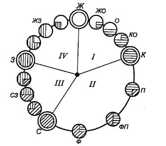 Ж - желтый; ЖО - желто-оранжевый; О - оранжевый; КО - красно-оранжевый; К - красный; П - пурпурный; ФП - фиолетово-пурпурный; Ф - фиолетовый; С - синий; СЗ - сине-зеленый; З - зеленый; ЖЗ - желто-зеленый; I, II, Ш, IV - цветовые зоны