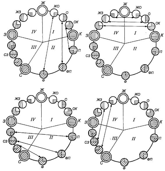 8. Родственно-контрастные сочетания характеризуются использованием цветов, находящихся на цветовом круге в соседних секторах и содержащих оттенки одного основного цвета и двух соседних основных цветов (черт. 4). Существуют четыре вида родственно-контрастных сочетаний: зелено-желто-красные, желто-красно-синие, красно-сине-зеленые, сине-зелено-желтые.