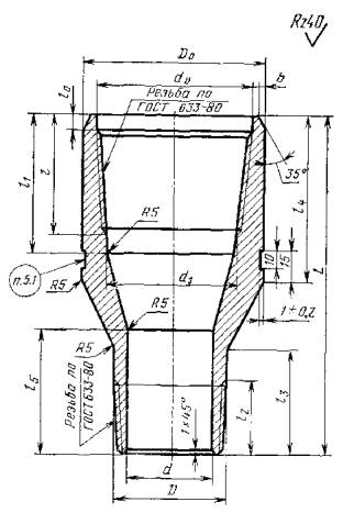 Постановлением Государственного комитета СССР по стандартам от 5 февраля 1980 г. № 555 срок действия установлен с 01.07.1980 г. до 01.07.1985 г. в части типов Г и Б с 01.01.1983 г. Несоблюдение стандарта преследуется по закону Настоящий стандарт распространяется на переводники, предназначенные для соединения между собой насосно-компрессорных труб разных диаметров, а также подземного оборудования, имеющего присоединительные концы с резьбой насосно-компрессорных труб, используемого при эксплуатации нефтяных и газовых скважин. 1. ТИПЫ, ОСНОВНЫЕ ПАРАМЕТРЫ И РАЗМЕРЫ1.1. Переводники должны изготовляться следующих типов: П - переводники с резьбой треугольного профиля для соединения гладких труб и труб с высаженными наружу концами; ПГ - переводники с трапецеидальной резьбой для соединения гладких высоко герметичных труб; ПБ - переводники для соединения безмуфтовых труб с высаженными наружу концами (Новая редакция, Изм. № 1) 1.2. Переводники типа П должны изготовляться следующих исполнений: 1 - с соотношением средних диаметров резьбы в основной плоскости муфты и ниппеля более 1 (черт. 1); 2 - с соотношением средних диаметров резьбы в основной плоскости муфты и ниппеля 0,6 - 0,7 (черт. 2); 3 - с соотношением средних диаметров резьбы в основной плоскости муфты и ниппеля 0,8 - 1,0 (черт. 3). (Измененная редакция, Изм. № 1) 1.3. Основные параметры и размеры переводников типа П должны соответствовать указанным на черт. 1 - 3 и в табл. 1 - 3; типа ПГ - на черт. 4 и в табл. 4; типа ПБ - на черт. 5 и в табл. 5. (Измененная редакция, Изм. № 1) Черт. Размеры в мм.